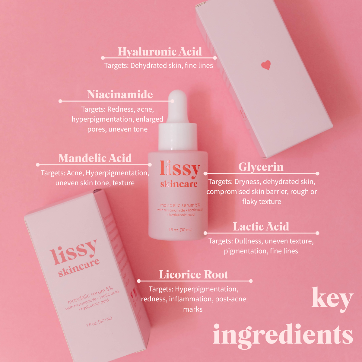 - L-Mandelic Acid: Gentle AHA that helps exfoliate the skin, break down oil, and reduce inflammation. An incredible acne-fighting ingredient that helps treat all types of acne.